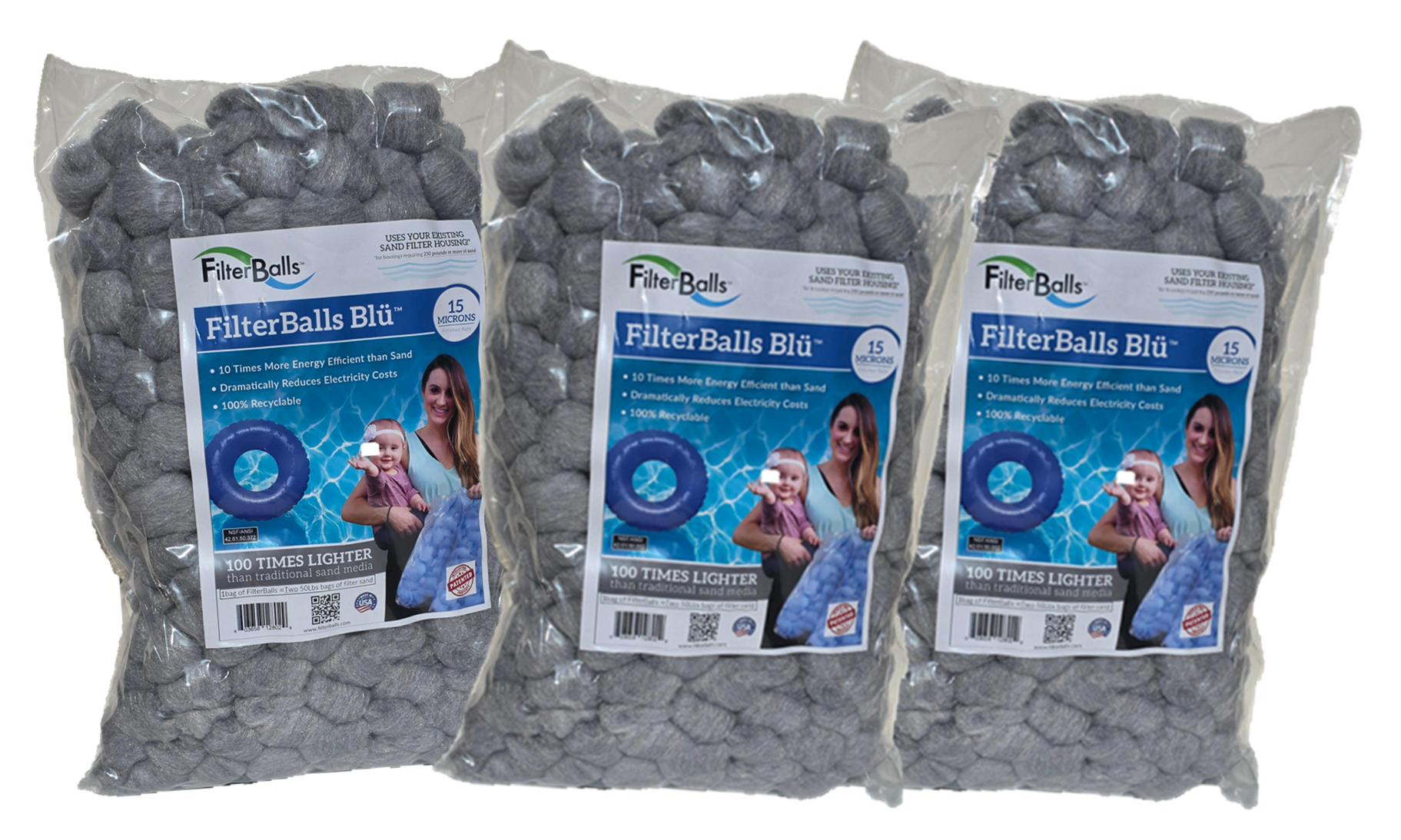- FILTERBALLS BLU WATER FILTER - The go-to filter for pool applications. At 15 microns, FilterBalls Blü is superior when compared to sand media with just 20-35 micron filtration. By using Blü, organic material such as pollens can now be removed, improving your water quality for clear results. Perfect for Swimming Pool, Spa, Water Parks, and Residential Commercial.